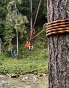 Am Freitag wurde dann alles für das große Projekt Seilbau vorbereitet. Anschließend galt es diese, noch ohne Flussüberquerung, im trockenen Aufzubauen und Fehler zu beseitigen. Anschließend wurde eine geeignete Flussstelle aufgesucht und die Seilbahn erfolgreich über den Fluss gespannt. Auch der zwischenzeitliche Regenschauer konnte die Laune der Jugendlichen nicht trüben.
