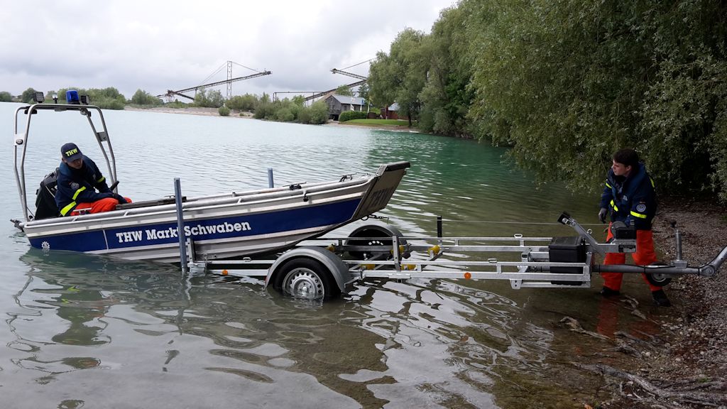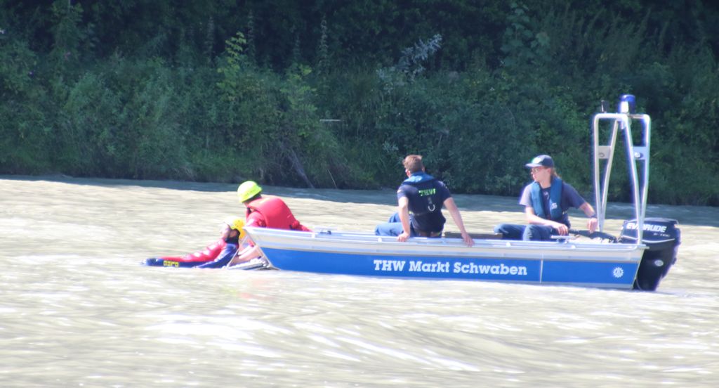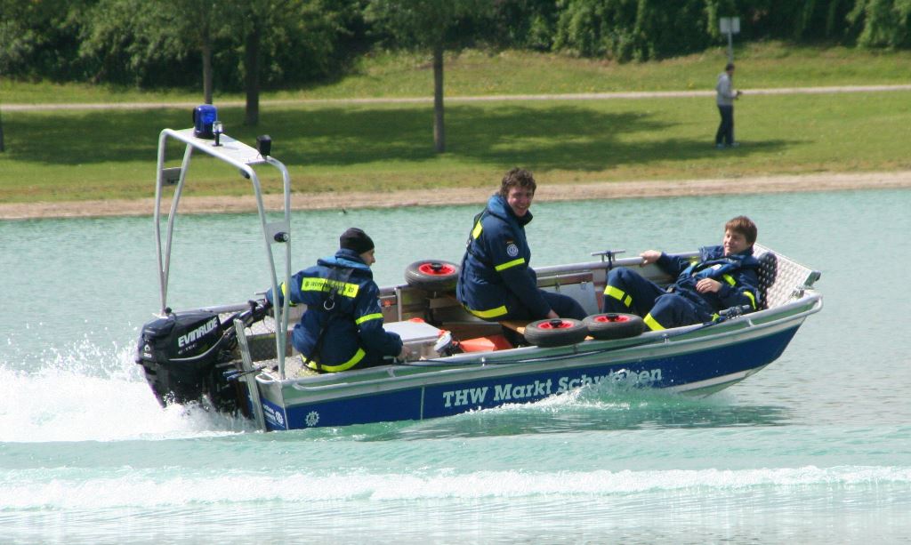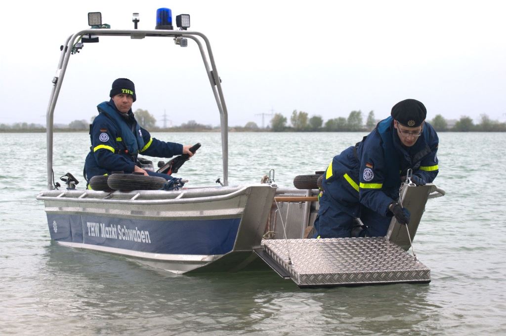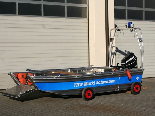 Durch die abnehmbaren Räder lässt es sich selbst in Gewässern oder Hochwasserlagen bewegen, in denen mangels Wassertiefe sonst kein Boot fahren könnte.